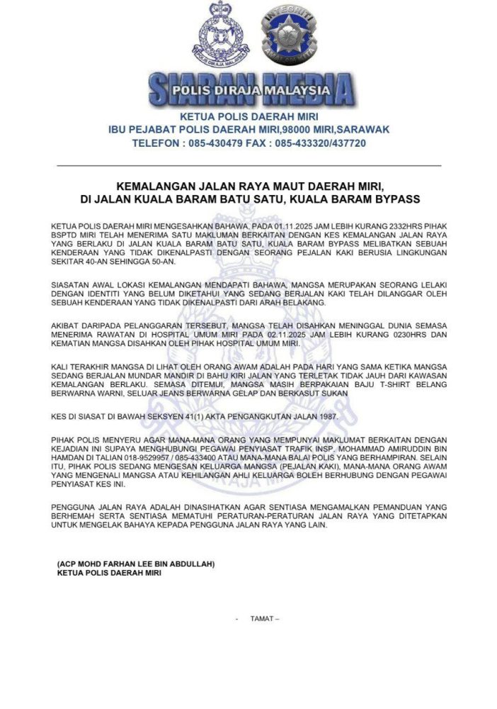 Ketua Polis Daerah Miri mengesahkan pihak Balai Siasatan dan Penguatkuasaan Trafik Daerah (BSPTD) menerima laporan berhubung kejadian itu sekitar 11.32 malam.