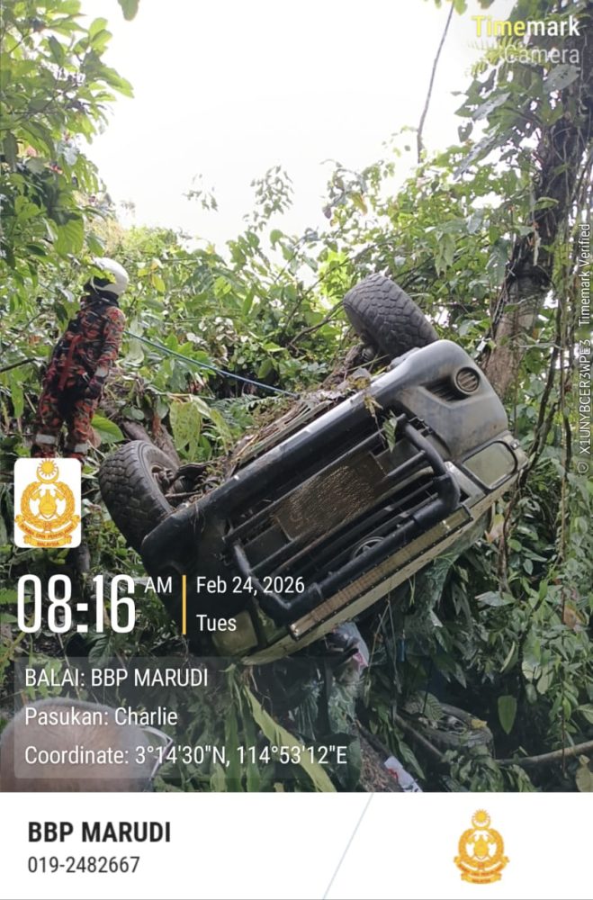 MIRI: Seorang lelaki maut manakala isterinya terselamat selepas kenderaan pacuan empat roda yang dinaiki mereka terjunam ke dalam gaung sedalam sekitar 15 meter berhampiran Kem Pelutan, Ulu Baram, awal pagi tadi.