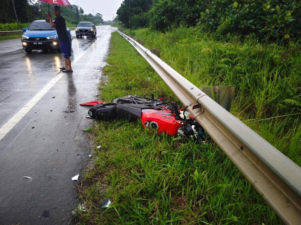 HILANG KAWALAN… Motosikal yang ditunggang oleh mangsa hilang kawalan lalu melanggar pengadang di tepi jalan.