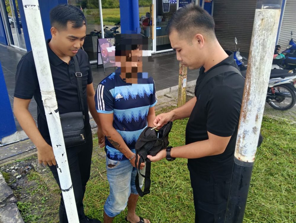 DITAHAN… Lelaki tempatan berusia 28 tahun yang disyaki terlibat dengan penyalahgunaan dadah ditahan polis di tepi Jalan Saratok, semalam. Foto IPD Saratok