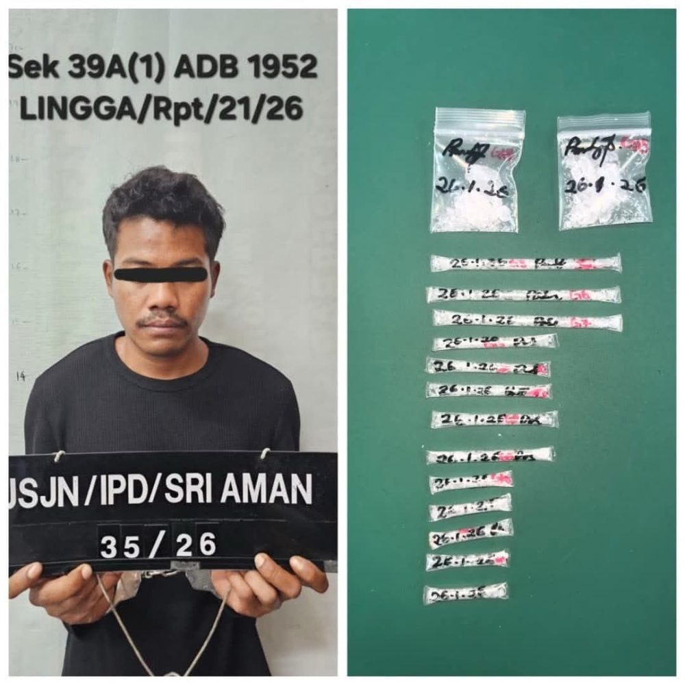 Menurut beliau, hasil pemeriksaan ke atas suspek berusia 26 tahun itu, polis menemui dua plastik kecil lutsinar berisi ketulan kristal disyaki dadah jenis syabu serta 13 keratan tiub straw lutsinar pelbagai saiz.