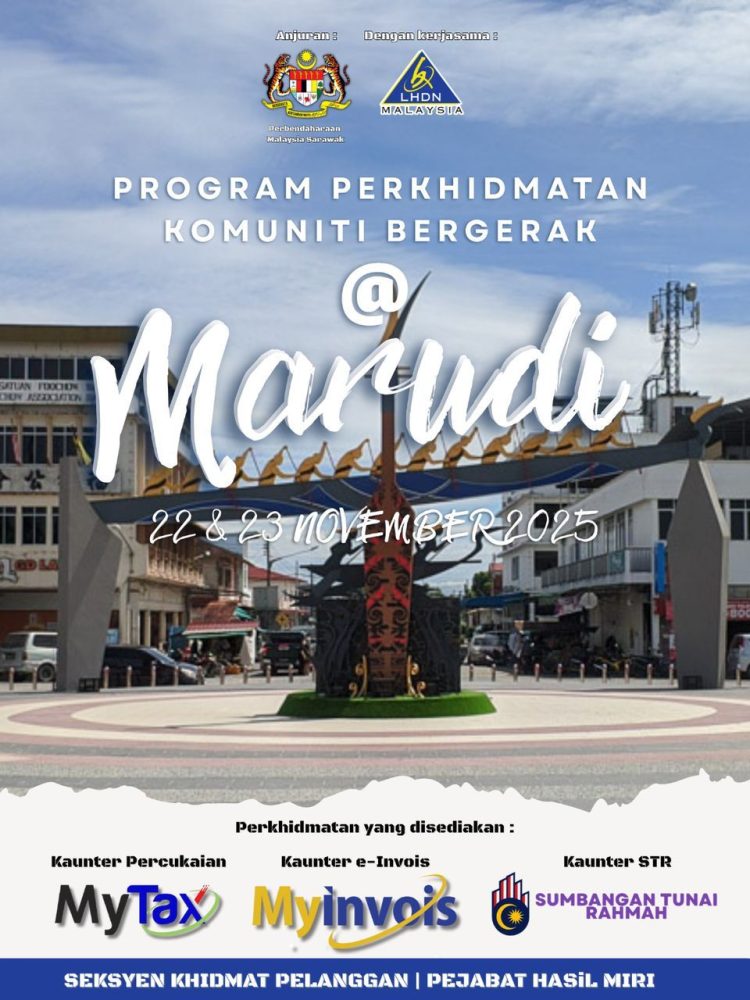 MARUDI: Lembaga Hasil Dalam Negeri (LHDN) Miri akan menganjurkan Program Perkhidmatan Komuniti Bergerak @Marudi bermula esok hingga Ahad di Dataran Marudi.
