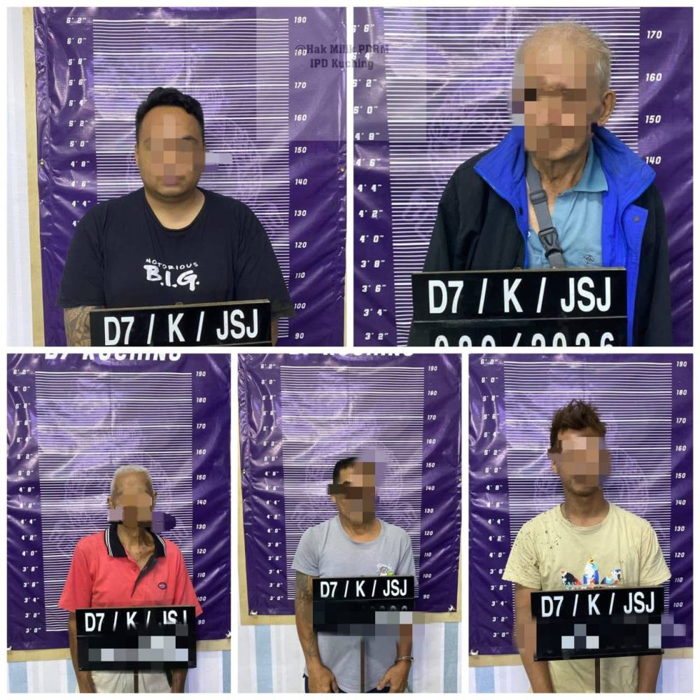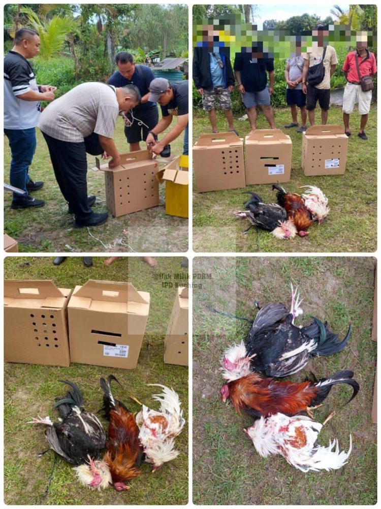 KUCHING: Polis menahan lima lelaki tempatan dalam satu serbuan ke atas kegiatan sabung ayam di sebuah tanah lapang di kawasan Sungai Apong, di sini, petang semalam.