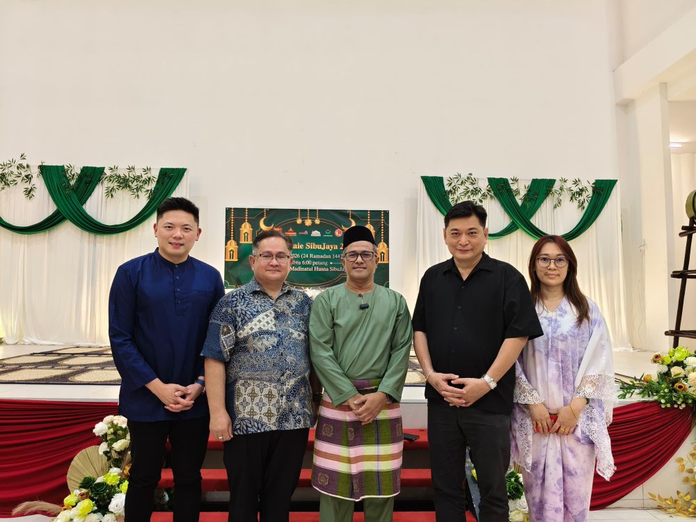 UNTUK ALBUM… (dari kiri) Setiausaha Politik kepada Premier Sarawak Joshua Ting Fu Ying, Pengerusi MDLBS Sempurai Petrus Ngelai, Pegawai Operasi Amcorp Properties Berhad, Mohd Rahimi Mohd Yusof, Setiausaha MDLBS Ng Siang Wei dan Pegawai Tugas-Tugas Khas kepada Menteri Pelancongan, Seni dan Budaya Dato Sri Tiong King Sing, Agatha Ting merakam kenangan bersama pada Majlis Iftar Jamaie Sibu Jaya 2026, semalam.