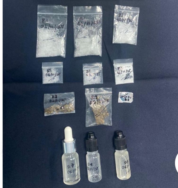 He added that police also found one red and silver foil-wrapped pill suspected to be Erimin 5 weighing 0.25 grams, two plastic bottles containing 10 ml of liquid suspected to be cannabis extract, and another bottle with 2 ml of similar liquid.