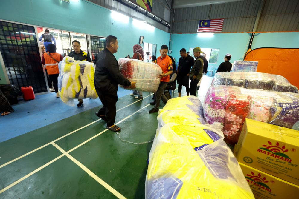 PETUGAS Jabatan Kebajikan Negeri Sarawak dan Angkatan Pertahanan Awam (APM) Sarawak mengangkut barangan keperluan harian untuk disalurkan kepada mangsa banjir di pusat pemindahan sementara (PPS) Dewan R-Piang, Kampung Budi Baru, hari ini. PPS itu menempatkan 197 mangsa banjir di sekitar bandar raya susulan hujan lebat sejak tengah malam. Foto BERNAMA