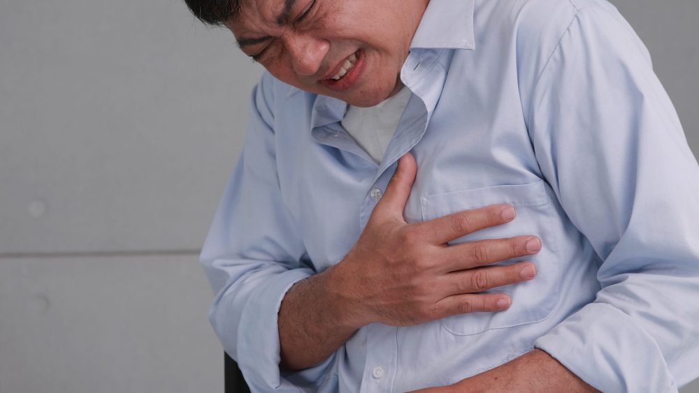 SEORANG lelaki Asia mengalami sakit dada yang disebabkan oleh penyakit jantung. Foto hiasan