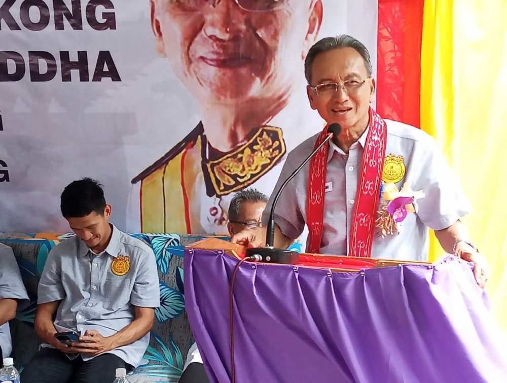 DATUK Mong Dagang menyampaikan ucapan pada Majlis Kunjungan Mesra di Tokong Ji Xuan Gong, menekankan pentingnya perpaduan dan keharmonian masyarakat berbilang agama di Sarawak. Foto: Pusat Khidmat ADUN Bukit Begunan
