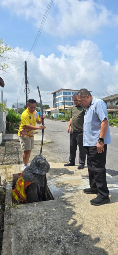 Datuk Bandar Kuching Selatan, Dato Wee Hong Seng, mengetuai lawatan tapak kali kedua bersama Ahli Majlis, pegawai kanan serta kontraktor penyelenggaraan longkang bagi mengambil tindakan secara langsung terhadap longkang tepi jalan yang tersumbat.