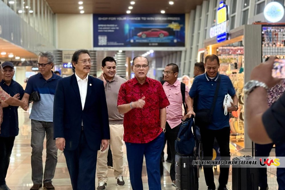 KUCHING: Menteri Besar Pahang, Dato’ Sri Diraja Wan Rosdy Wan Ismail bersama isteri, Datin Sri Diraja Dato’ Burhah Mohammed, selamat tiba di Lapangan Terbang Antarabangsa Kuching (KIA) semalam bagi memulakan lawatan rasmi tiga hari ke Sarawak.
