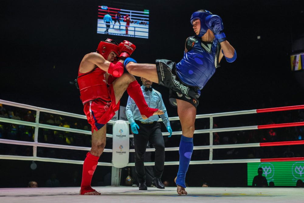 ATLET Muay Thai negara Muhammad Mikail Ghazali Zulfikar (kanan) melancarkan serangan ke atas atlet tuan rumah Suphakon Sirilun pada perlawanan akhir kategori 57 kilogram di Sukan SEA Thailand 2025 baru-baru ini. Beliau meraih pingat emas dalam acara tersebut. Foto Bernama
