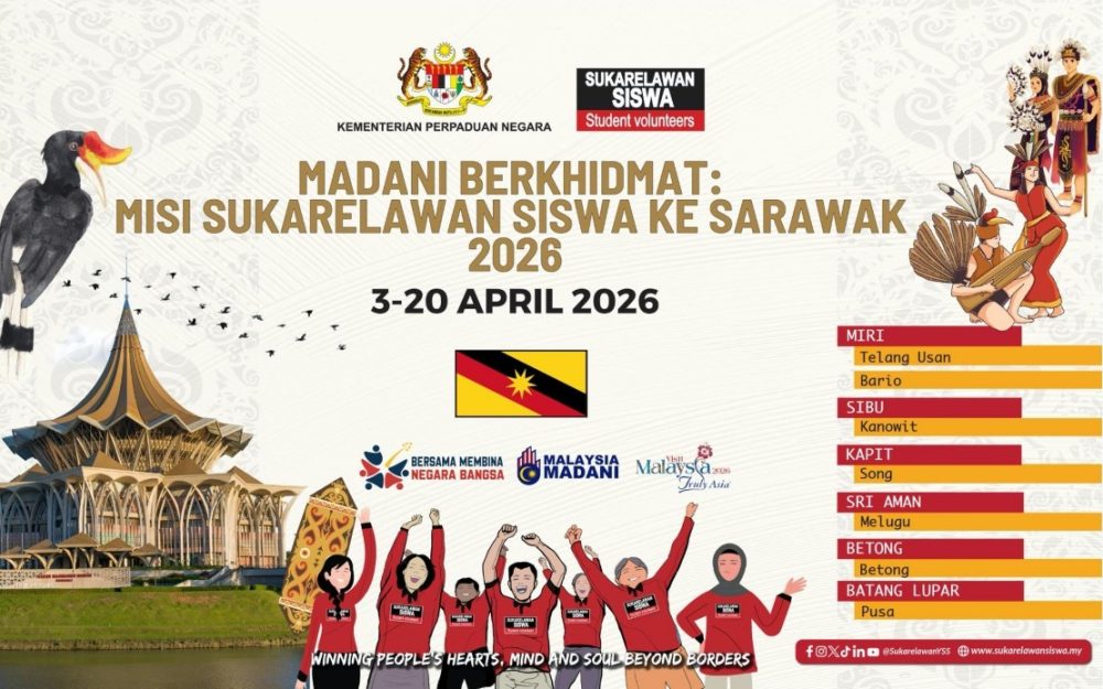 PUTRAJAYA: Kementerian Perpaduan Negara menerusi Yayasan Sukarelawan Siswa (YSS) melaksanakan inisiatif MADANI Berkhidmat: Misi Sukarelawan Siswa ke Sarawak 2026 bermula semalam hingga 20 April ini bagi menyemarakan lagi budaya kesukarelawanan, khususnya dalam kalangan belia.