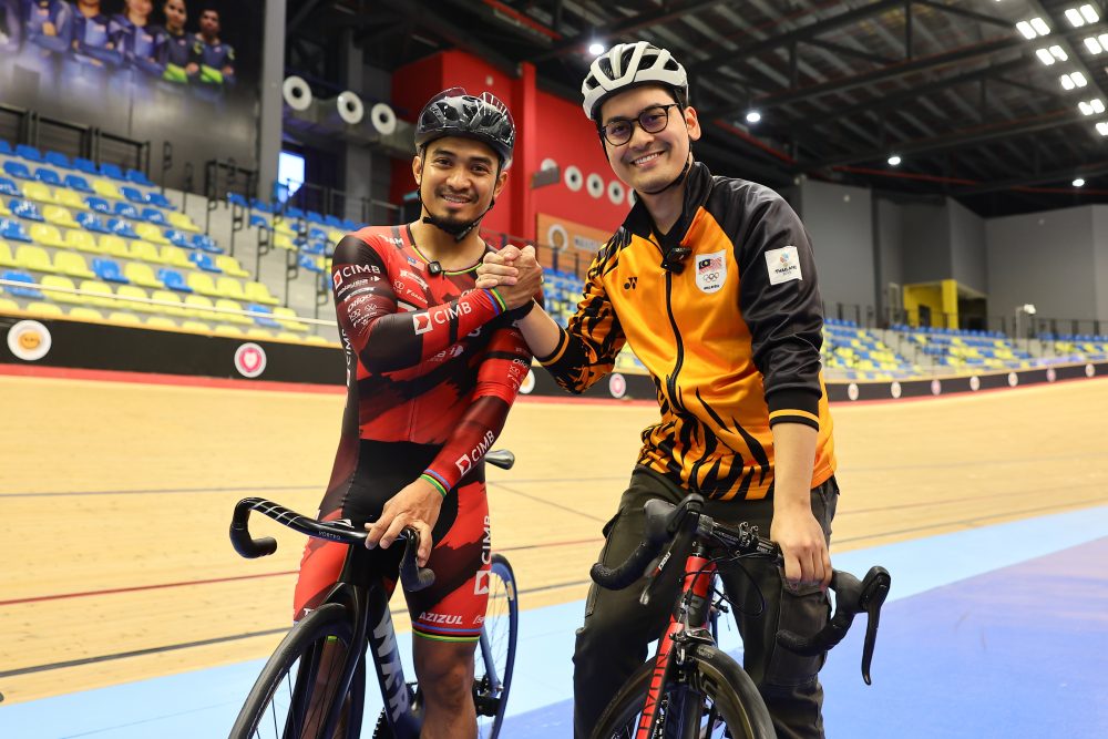MENTERI Belia dan Sukan Mohammed Taufiq Johari mengayuh basikal bersama jaguh berbasikal trek negara Datuk Azizulhasni Awang ketika mengadakan lawatan di velodrom bersempena Kejohanan UCI Track World Cup hari ini. Foto BERNAMA