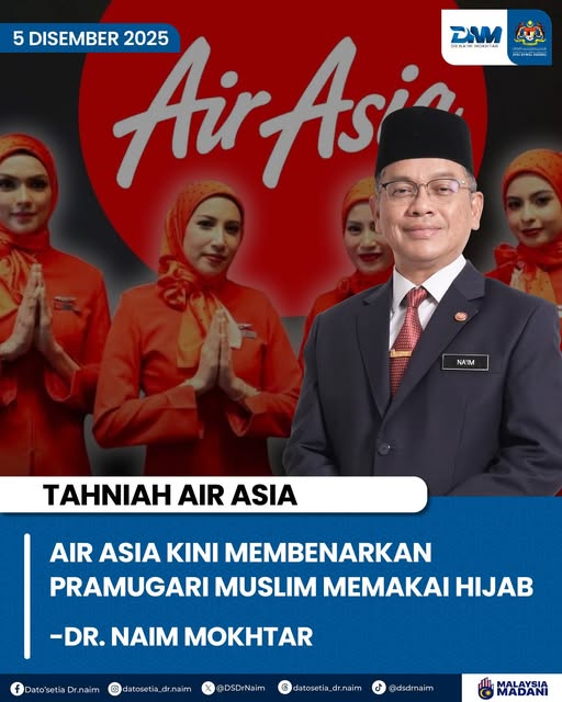 KUALA LUMPUR: Keputusan AirAsia membenarkan kru kabin wanita memakai hijab ketika bertugas di semua laluan penerbangan bermula tahun depan adalah langkah progresif dan amat dialu-alukan, kata Menteri di Jabatan Perdana Menteri (Hal Ehwal Agama) Datuk Dr Mohd Na’im Mokhtar.