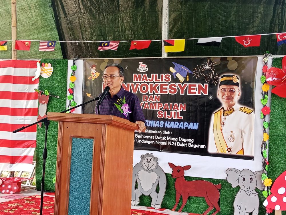 Datuk Mong Dagang semasa hadir pada majlis Konvokesyen dan Perasmian Dewan Tadika Tunas Harapan Tanjung Bijat semalam. Foto: Pusat Khidmat ADUN Bukit Begunan