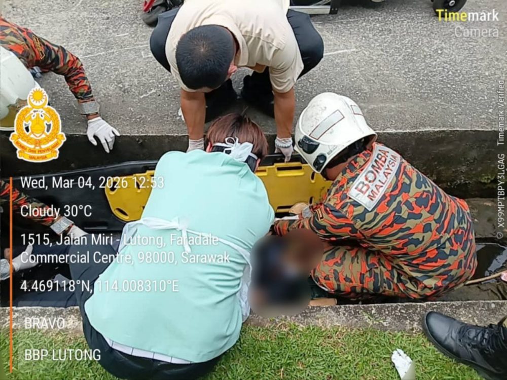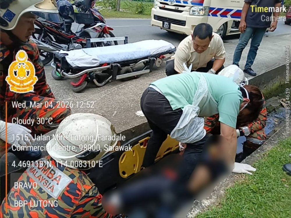 MIRI: Seorang lelaki cedera selepas motosikal yang ditunggangnya terbabas sebelum terjatuh ke dalam longkang berhampiran kawasan Petronas Lutong, tengah hari tadi.
