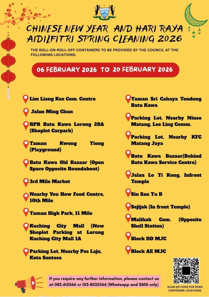 KUCHING: Sempena sambutan Tahun Baharu Cina dan Hari Raya Aidilfitri yang bakal tiba, Majlis Perbandaran Padawan (MPP) telah menyediakan kontena ‘Roll on Roll off (RoRo)’ di lokasi terpilih bagi membolehkan penduduk melupuskan sisa pukal dari 6 hingga 20 Februari depan.