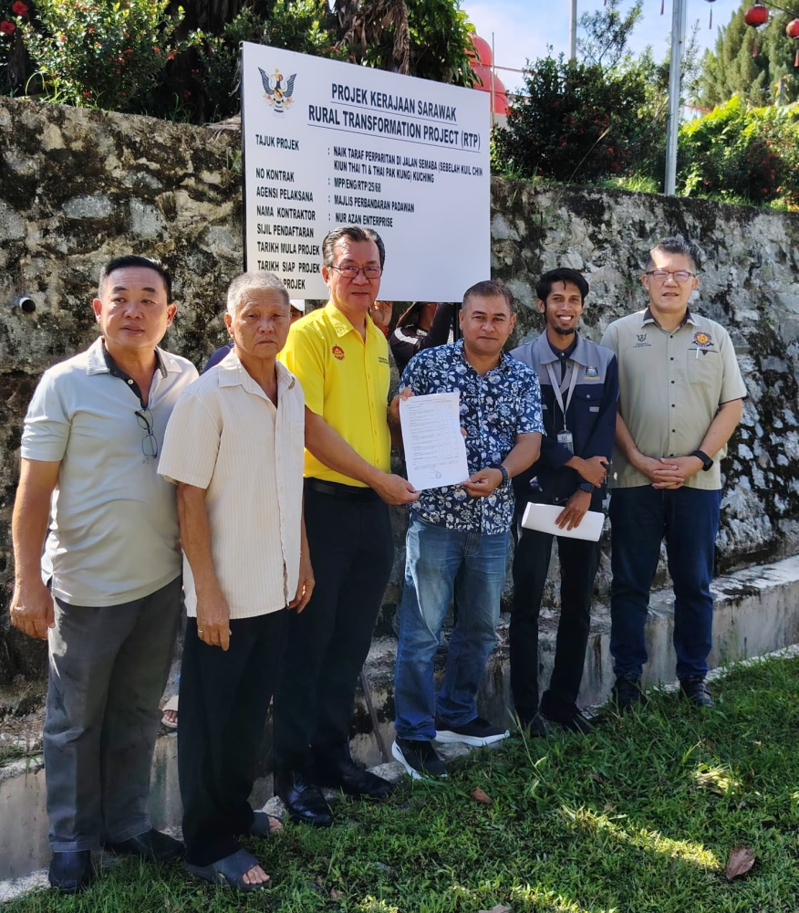 WILFRED Yap bersama pegawai Majlis Perbandaran Padawan menyerahkan surat tawaran kepada kontraktor bagi projek naik taraf jalan di Lorong Semaba 8 bernilai RM30,000 untuk meningkatkan keselamatan dan infrastruktur penduduk setempat.