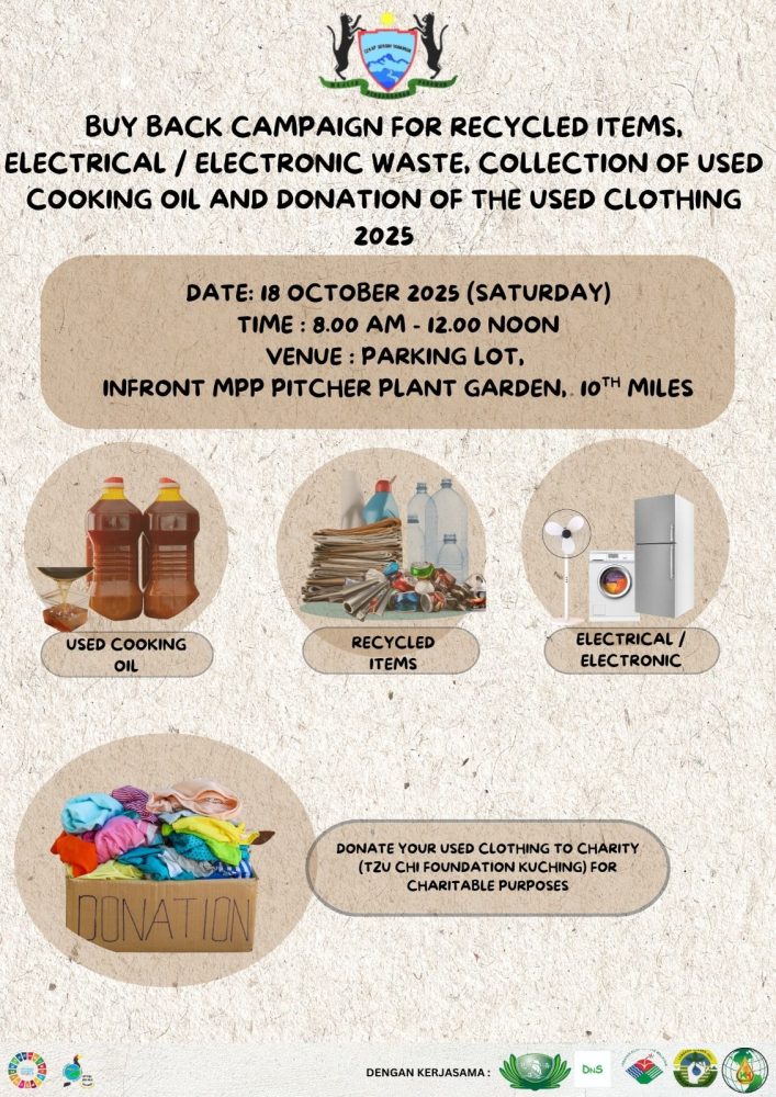 KUCHING: The Padawan Municipal Council (MPP) will be holding its Buy Back Campaign for recycled items, electrical and electronic waste (B.E.E.), collection of used cooking oil, and donation of used clothing at the parking area in front of MPP Pitcher Plant Garden, Mile 10 on Saturday, 18 October 2025, from 8 a.m. to 12 p.m.