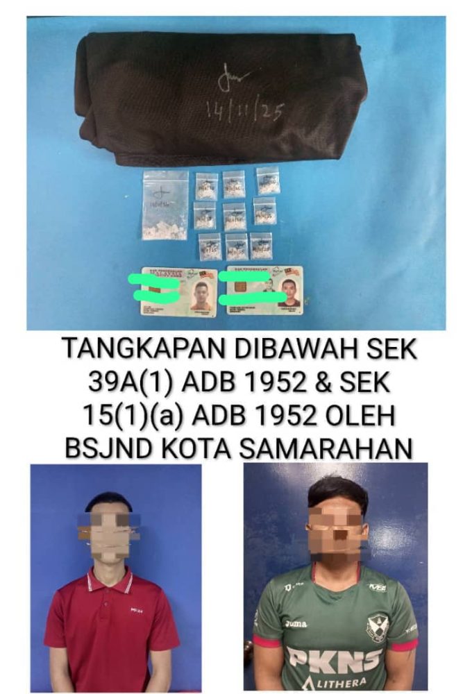 Ketua Polis Daerah Samarahan, Supt Damataries Lautin berkata, sepanjang operasi tersebut, seorang suspek ditahan di bawah Seksyen 39A(2) Akta Dadah Berbahaya, enam di bawah Seksyen 39A(1), 18 di bawah Seksyen 12(2) Akta Dadah Berbahaya 1952, seorang di bawah Seksyen 30(3) Akta Racun, dan 65 individu di bawah Seksyen 15(1)(a) Akta Dadah Berbahaya 1952.