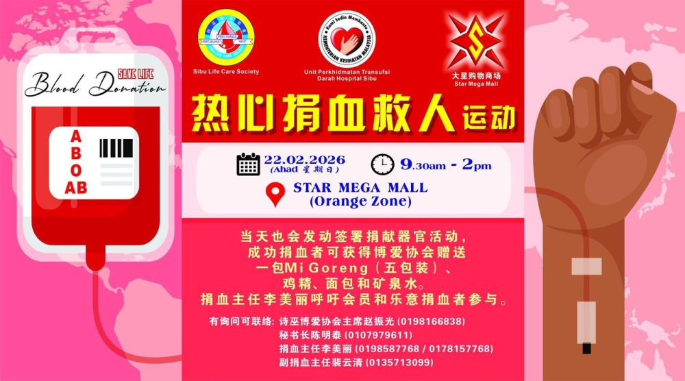 Kempen tersebut merupakan kerjasama dengan Unit Perkhidmatan Transfusi Darah Hospital Sibu dan Star Mega Mall di sini. Program bermula dari 9.30 pagi hingga 2.00 petang.