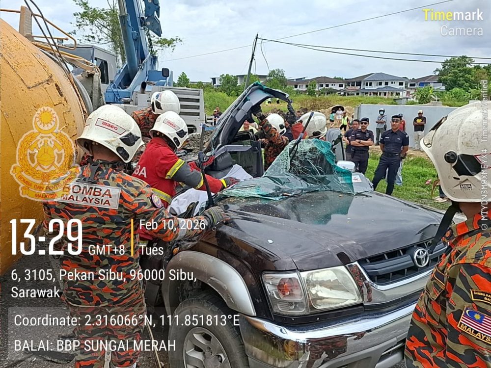 WARGA EMAS…Lelaki maut kenderaan pacuan empat roda dihempap lori simen di Jalan Deshon. Foto PGO Bomba Sarawak