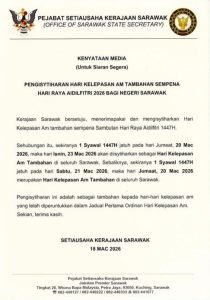 KUCHING: Kerajaan Sarawak mengumumkan satu hari cuti tambahan sempena sambutan Aidilfitri tahun ini. Setiausaha Kerajaan Sarawak Datuk...