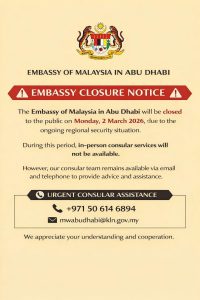 KUALA LUMPUR: Kedutaan Besar Malaysia di Abu Dhabi akan ditutup kepada orang ramai pada hari ini (2...