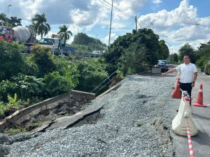 Michael Kong menunjukkan jalan runtuh. KUCHING: Kejadian runtuhan jalan mendap di Lorong Apt 2 mendapat kecaman daripada...