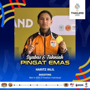 BANGKOK: Kejayaan penembak negara Haritz Iklil Hessly Hafiz merangkul pingat emas acara 50 meter (m) rifle tiga posisi...