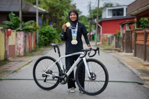 KEMAMAN: Pelumba berbasikal negara, Nur Aisyah Mohamad Zubir, yang memenangi emas dalam acara scratch wanita pada Sukan SEA...