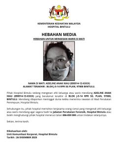 BINTULU: Hospital Bintulu memohon kerjasama orang ramai bagi membantu mengesan waris atau ahli keluarga kepada seorang wanita...