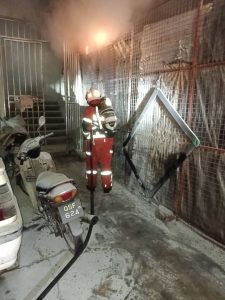 Pasukan bomba berusaha memadamkan kebakaran di lokasi kejadian. Foto kredit PGO Bomba Sarawak SIBU: Satu kebakaran kecil...