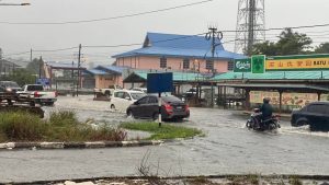 BATU NIAH: Jalan utama menuju ke pekan Batu Niah dilanda banjir kilat susulan hujan berterusan sejak 8.00...