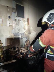 MIRI: Tindakan pantas pemilik premis menyiram air bagi memadamkan api yang mula marak di ruang sembahyang kedainya...