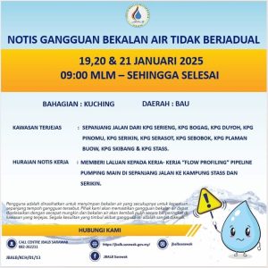 BAU: Beberapa kawasan di Daerah Bau dijangka mengalami gangguan bekalan air tidak berjadual bermula malam ini hingga...