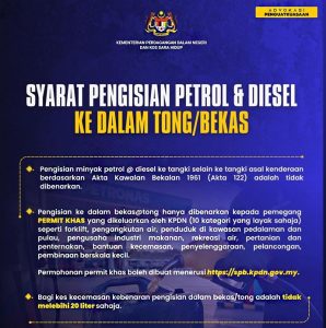 KUALA LUMPUR: Pengisian minyak petrol atau diesel ke dalam bekas atau tong hanya dibenarkan kepada pemegang permit...