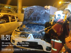 SARIKEI: Sebuah kenderaan pacuan empat roda jenis Mitsubishi Pajero terbakar kira-kira 50 peratus pada bahagian enjin dalam...
