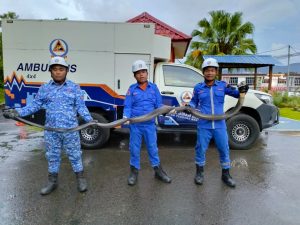 LAWAS: Sepasukan anggota Angkatan Pertahanan Awam (APM) Lawas berdepan cabaran untuk menangkap seekor ular tedung selar seberat...
