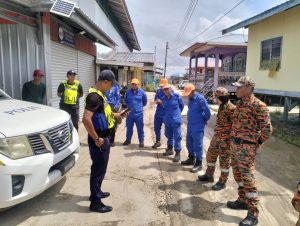 SIAP SEDIA…Pasukan bomba dan polis berada di Pos Kawalan Operasi Bomba (PKOB) Kampung Tekajong. Foto kredit JBPM...