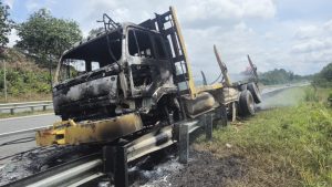 SELANGAU: Lori balak bersama treler musnah dalam kebakaran di Batu 62 Sepiring, Lebuh Raya Pan Borneo Bintulu–Sibu...