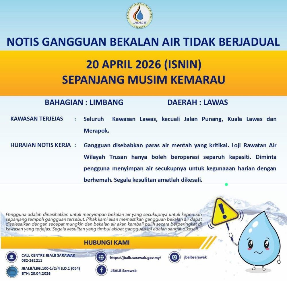 Dalam satu notis, JBALB memaklumkan gangguan berkenaan bagaimanapun tidak melibatkan kawasan Jalan Punang, Kuala Lawas dan Merapok kerana ketiga-tiga lokasi tersebut menerima bekalan daripada loji rawatan air yang berasingan.