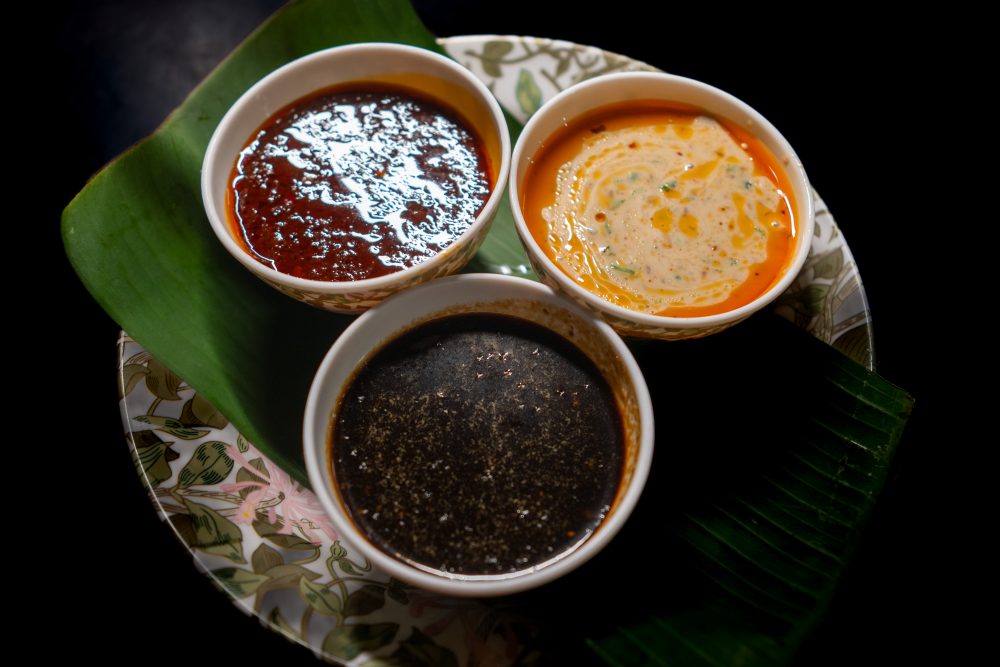 TIGA pilihan sos pencecah iaitu kuah kacang, sos hitam cili api dan sos sukiya bagi hidangan sate untuk dinikmati pelanggan di gerai Warong Daun Emas, baru-baru ini. Foto BERNAMA