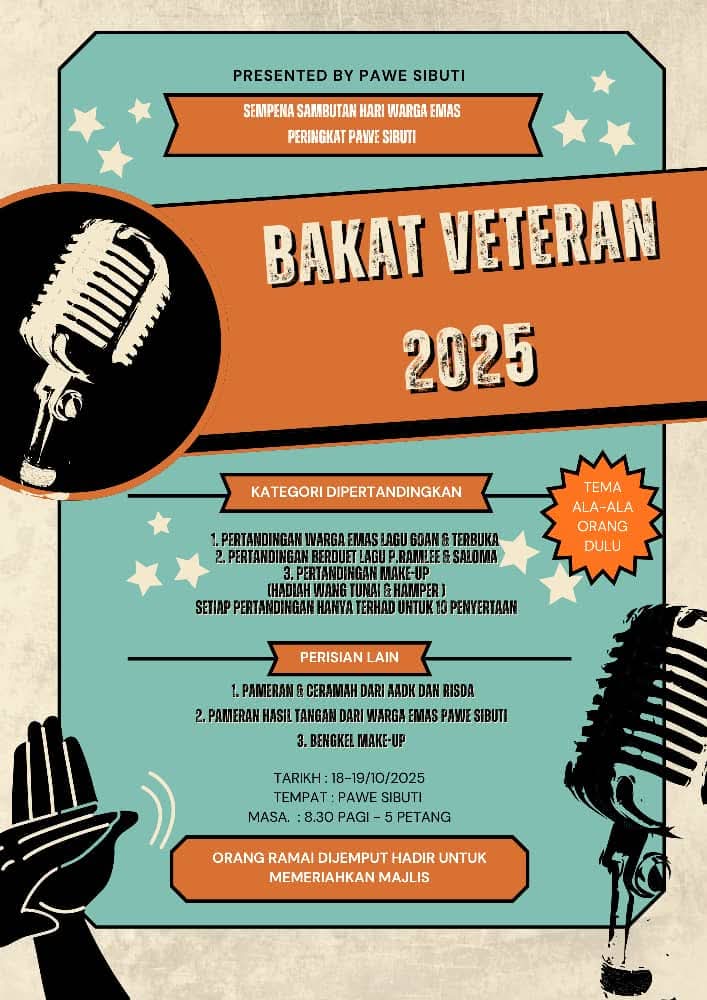 BEKENU: Sempena sambutan Hari Warga Emas 2025, Pusat Aktiviti Warga Emas (PAWE) Sibuti dengan kerjasama Skuad Antidadah Miri dan RISDA Bahagian Miri akan menganjurkan program ‘Kilauan Emas: Bakat Veteran 2025’ pada 18 hingga 19 Oktober depan.