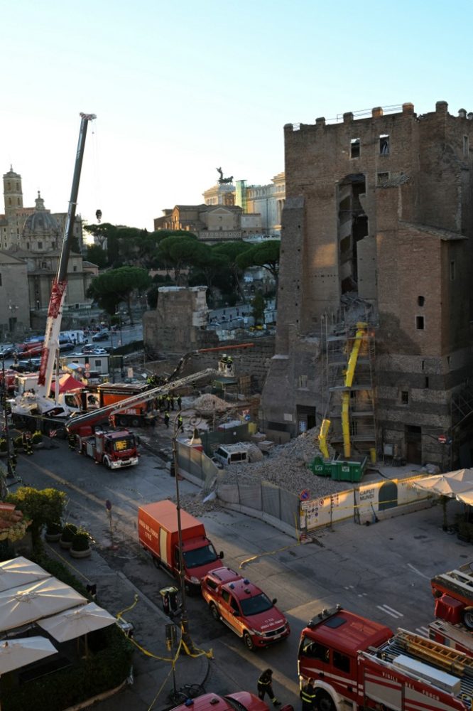 BOMBA sedang bekerja di tapak selepas sebahagian menara zaman pertengahan Torre dei Conti runtuh berhampiran Forum Rom di pusat bersejarah Rom pada 3 November 2025. Foto AFP