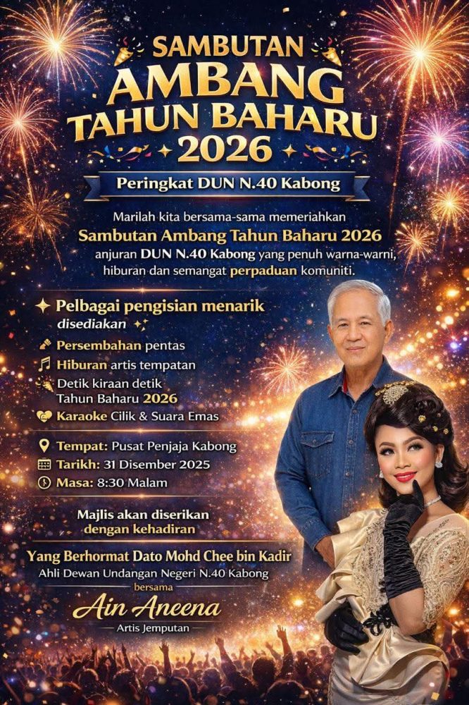 KABONG: Sambutan Ambang Tahun Baharu 2026 peringkat Dewan Undangan Negeri (DUN) Kabong dijangka berlangsung meriah dengan pelbagai pengisian menarik yang memfokuskan hiburan rakyat serta pengukuhan perpaduan komuniti setempat, bertempat di Pusat Penjaja Kabong, malam esok.