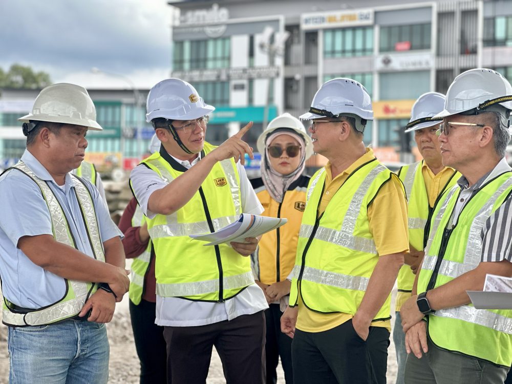 JOHNNY Pang Leong Ming berbincang dengan pegawai JKR dan wakil agensi pelaksana mengenai langkah keselamatan serta susun atur laluan sementara di kawasan pembinaan.