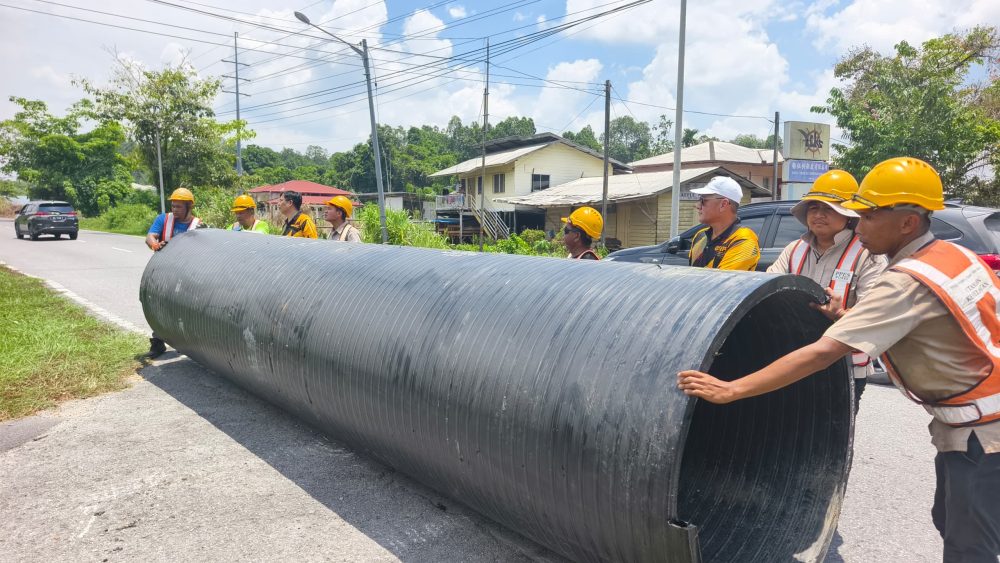 JKR….Sedang menjalankan kerja-kerja pemasangan pembentung baharu di Sungai Bidut.