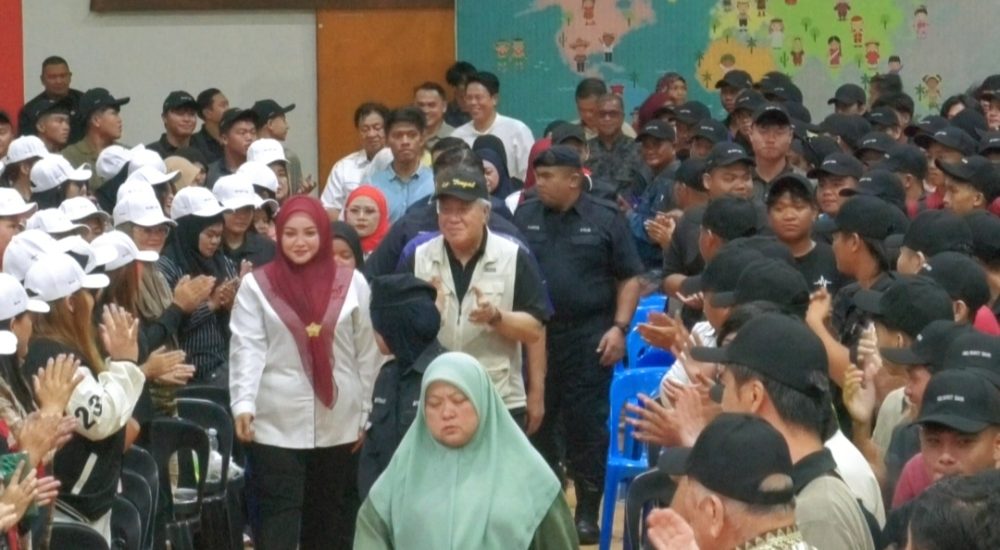TEPUKAN GEMURUH… Awang Tengah diiringi Hasbi menerima tepukan paling gemuruh daripada hampir seribu hadirin yang memenuhi ruang Stadium Tertutup Lawas sempena majlis penutupan Program MyLesen.