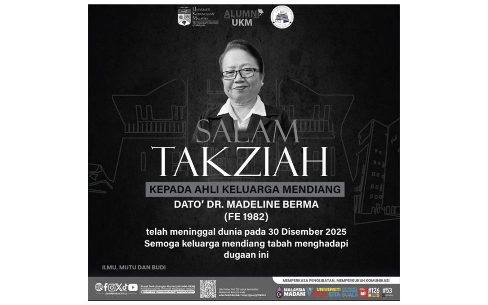 KUALA LUMPUR:  Pemergian penganalisis ekonomi Prof Datuk Dr Madeline Berma hari ini turut dirasai oleh ahli ekonomi dan warga akademik, serta alumni Universiti Kebangsaan Malaysia (UKM).